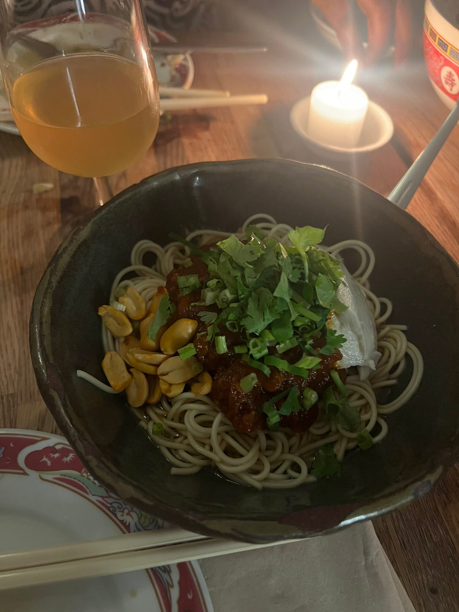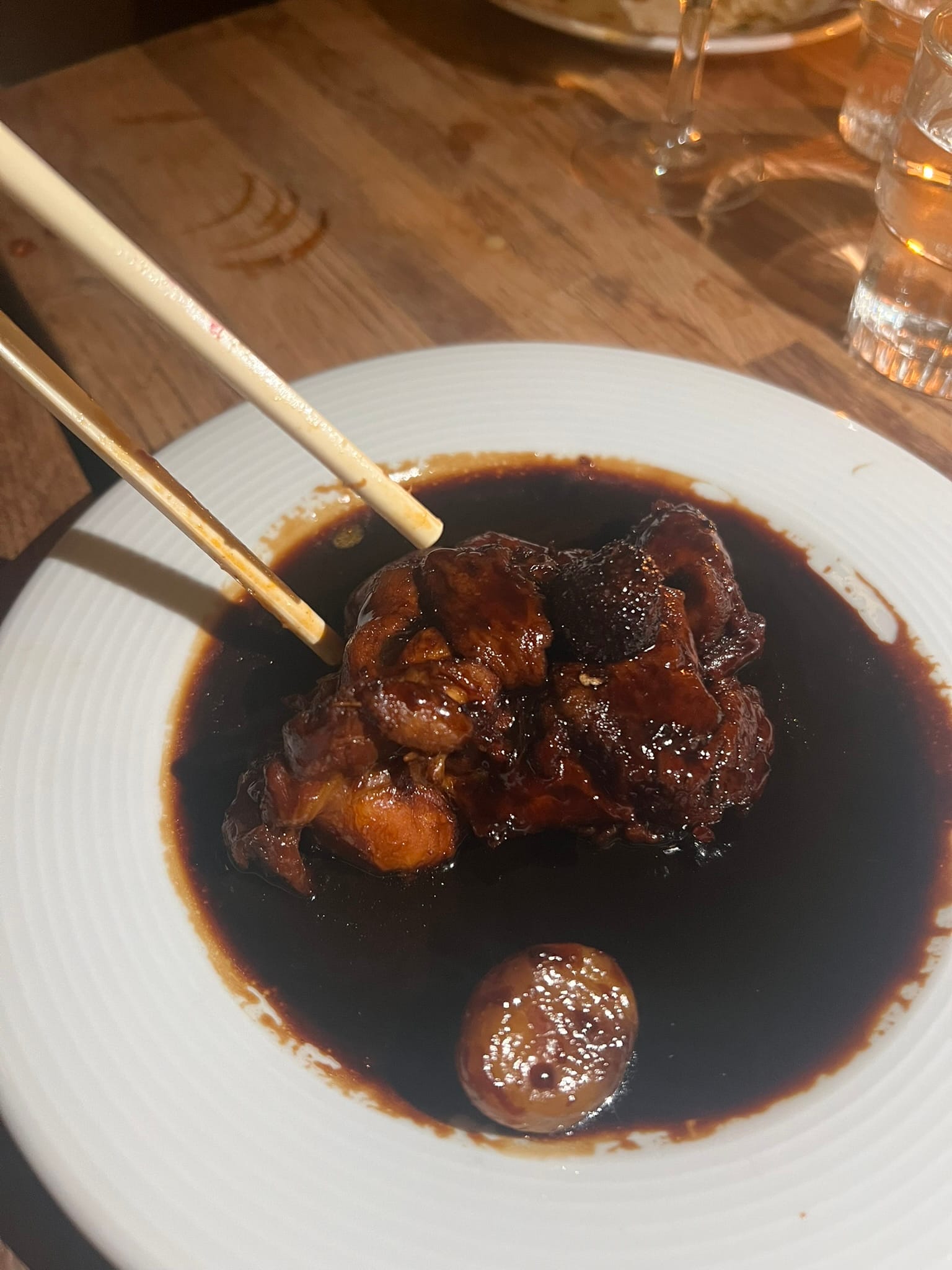Entre son poulet chinois braisé fondant et ses nouilles dan dan d’une justesse rare, le petit comité n’a pas mis longtemps à oublier le programme initial.