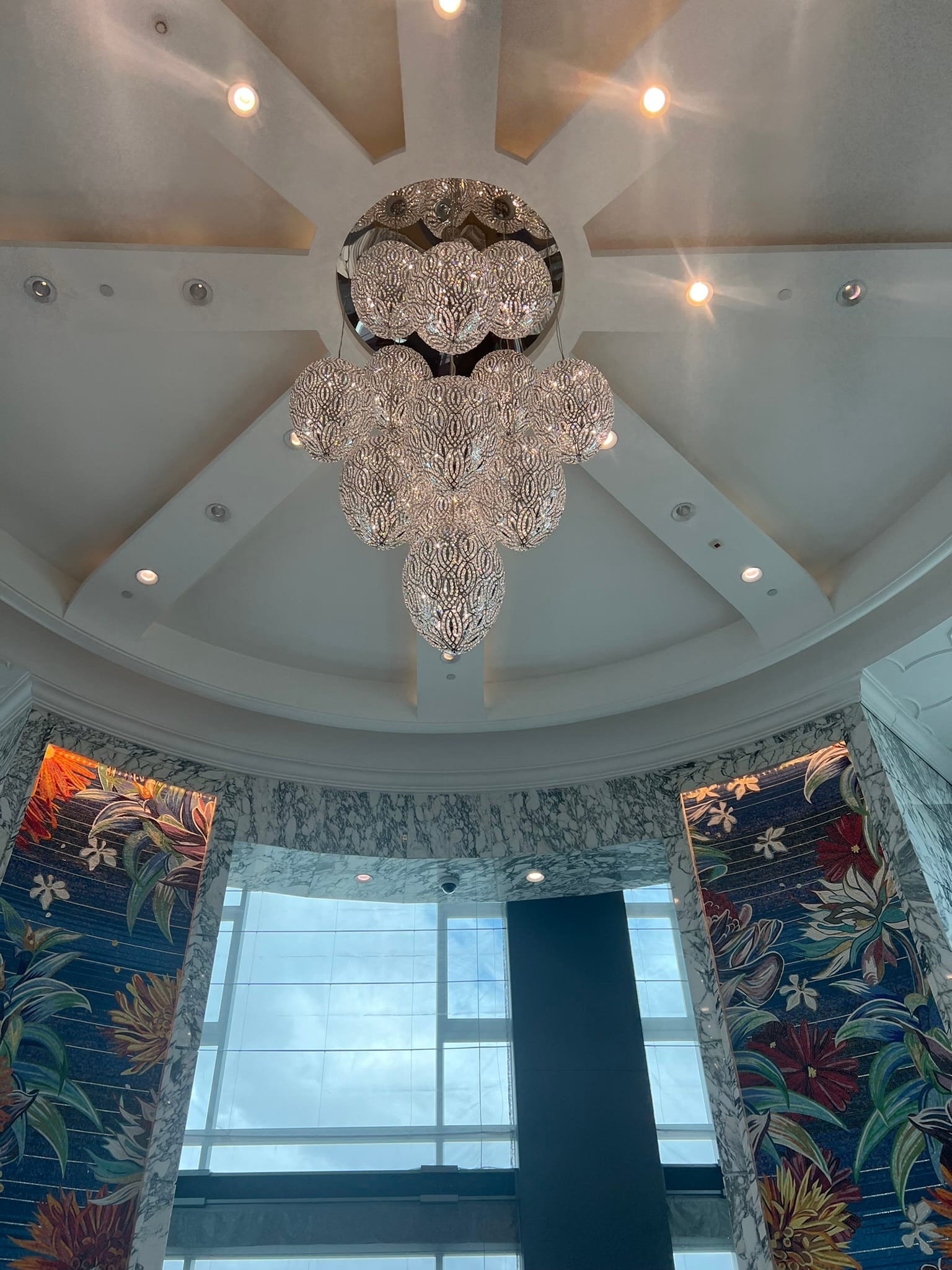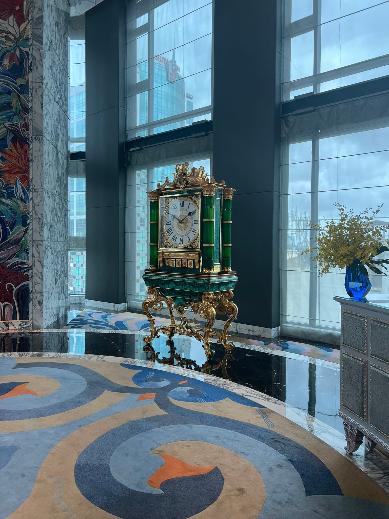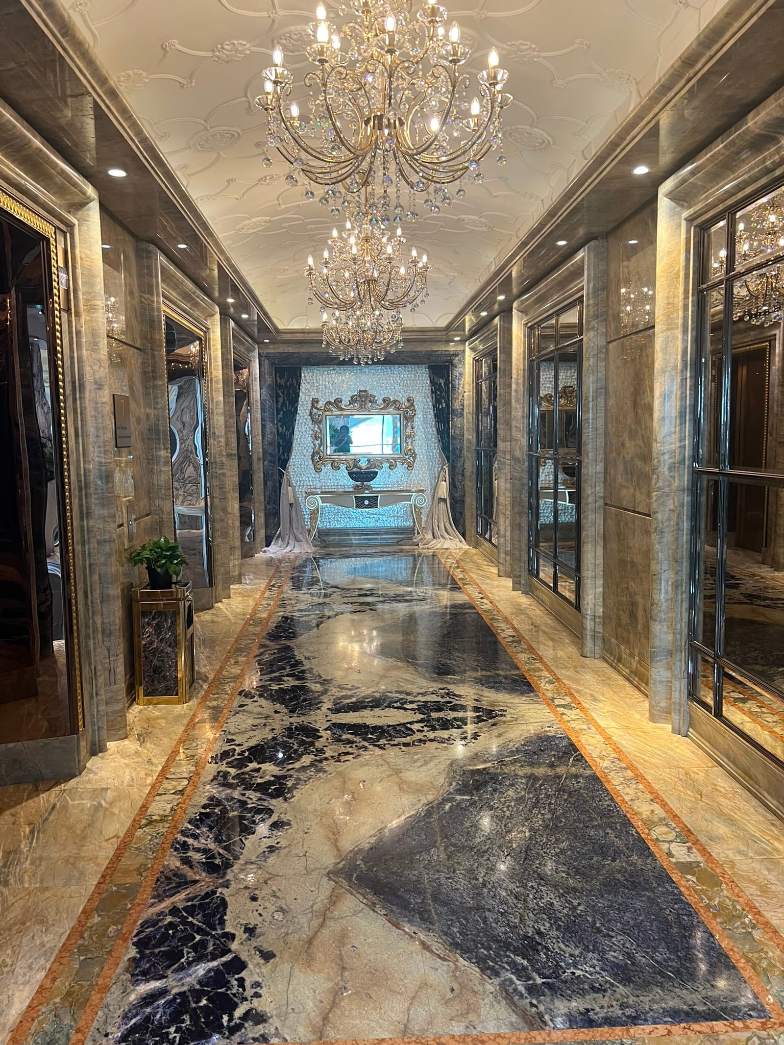 Le lobby, c’est un manifeste esthétique. Marbres d’Italie, mosaïques colorées, lustres sculpturaux, fauteuils baroques qui auraient pu sortir d’un film de Fellini… Tu avances, et chaque détail t’invite à ralentir une seconde, juste pour regarder.